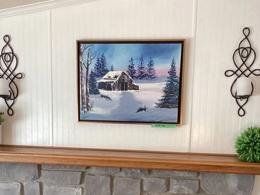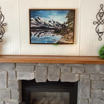 Patterned after the famous Bob Ross outdoor scenes, this 18 inch by 24 inch canvas painting brings out the blue hue detail of a mountain reflection.