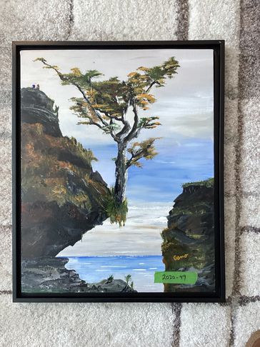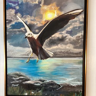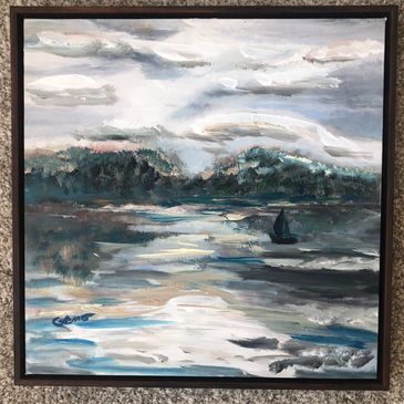 A majestic and yet peaceful 14 by 18 inch painting with a unique 4 inch wide recessed frame, which makes it 20 x 24.