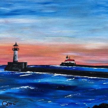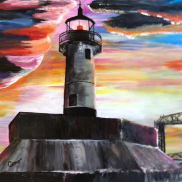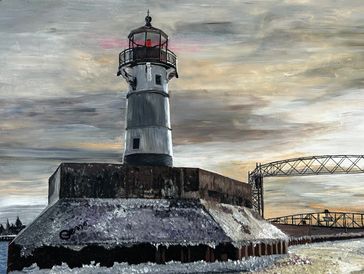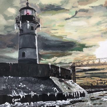 this is an excellent acrylic depiction of the Duluth ship canal in winter. A very unusual view from the frozen ice platform.