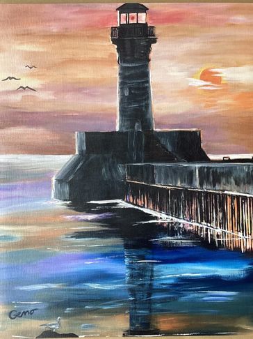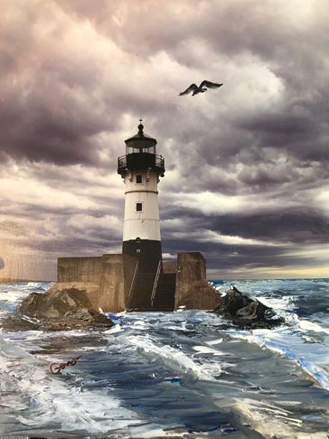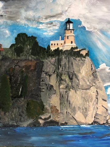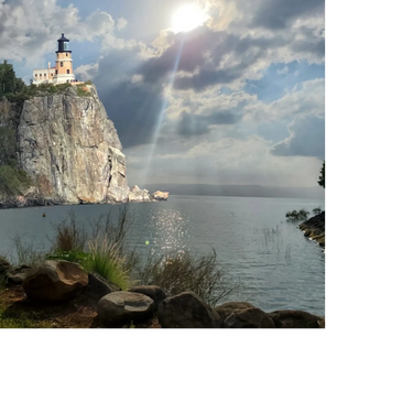 Depicts the Split Rock lighthouse at Grand Marais MN. A photo I took however the sky was quite bland that day. In 2021 my wife and I visited Israel with our church group tour. We stayed on the shores of the Sea of Galilee for two of those days. I then took a picture of the sky overlooking the Sea of Galilee. I was able to photo shop the Galilee sky and water as a background to my Split rock picture and add a few white water lines on the shore.