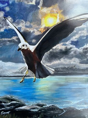 ORIGINALY an 18 BY 24 INCH CANVAS depicting a seagull landing on the shore of the sea of Galilee in Israel..however it can be reproduced also as a 16 x 20.